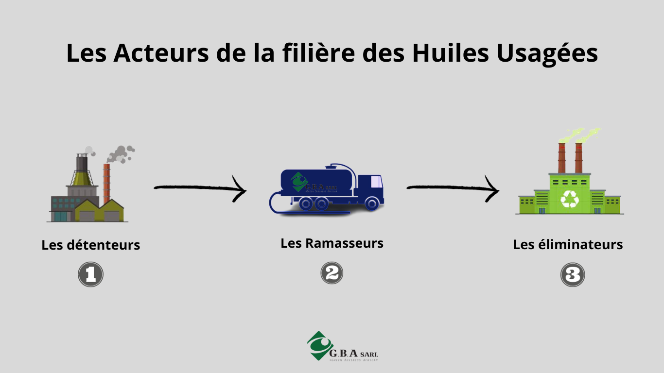 Les acteurs de la filière sont les détenteurs ou producteurs d’huiles usagees, les ramasseurs ou collecteurs et les éliminateurs auxquels s’imposent une série d’obligations mentionnée dans l’Arrêté Interministériel n° 9311 du 05 Octobre 2007 portant gestion des huiles usagées.